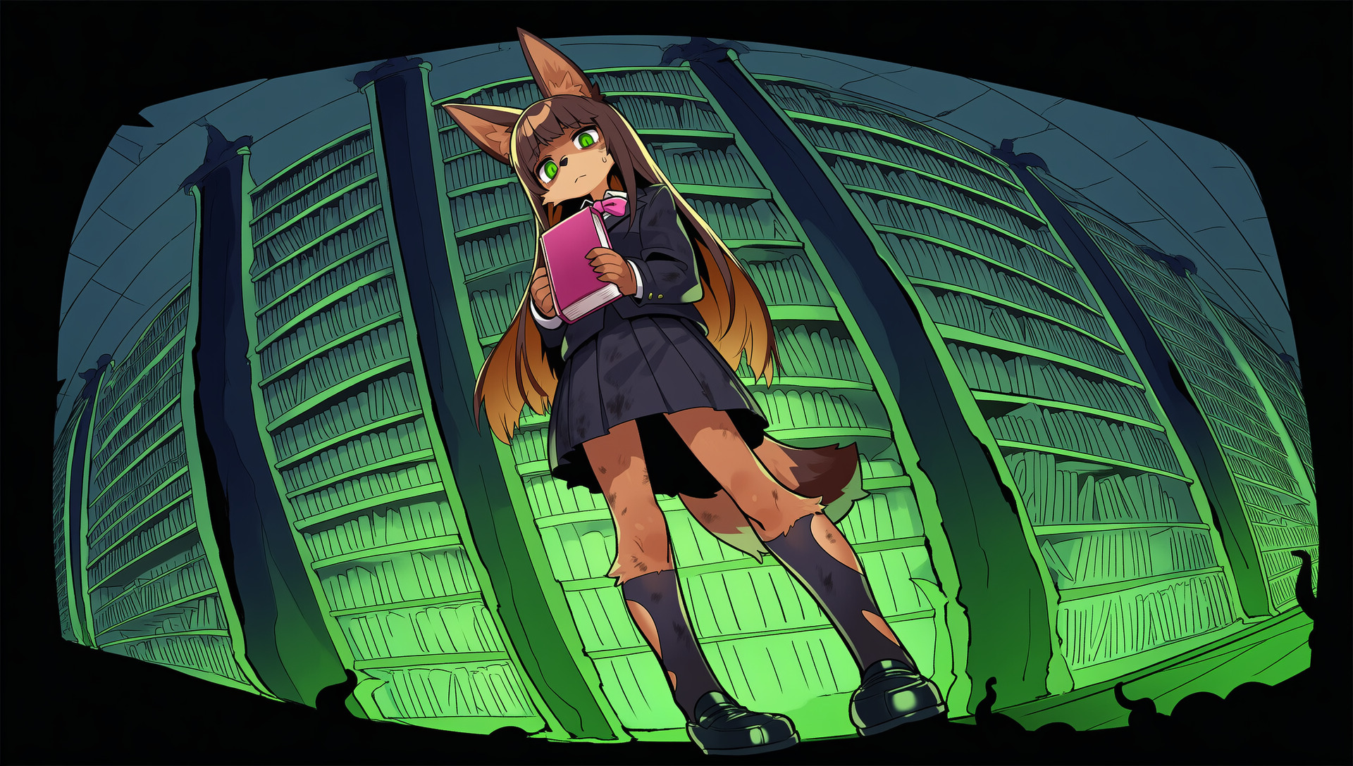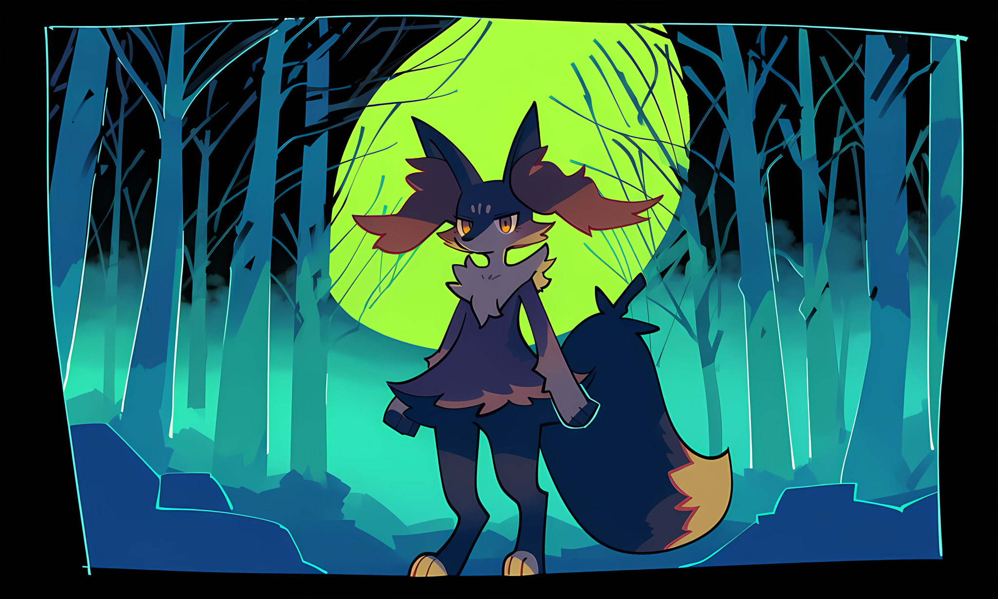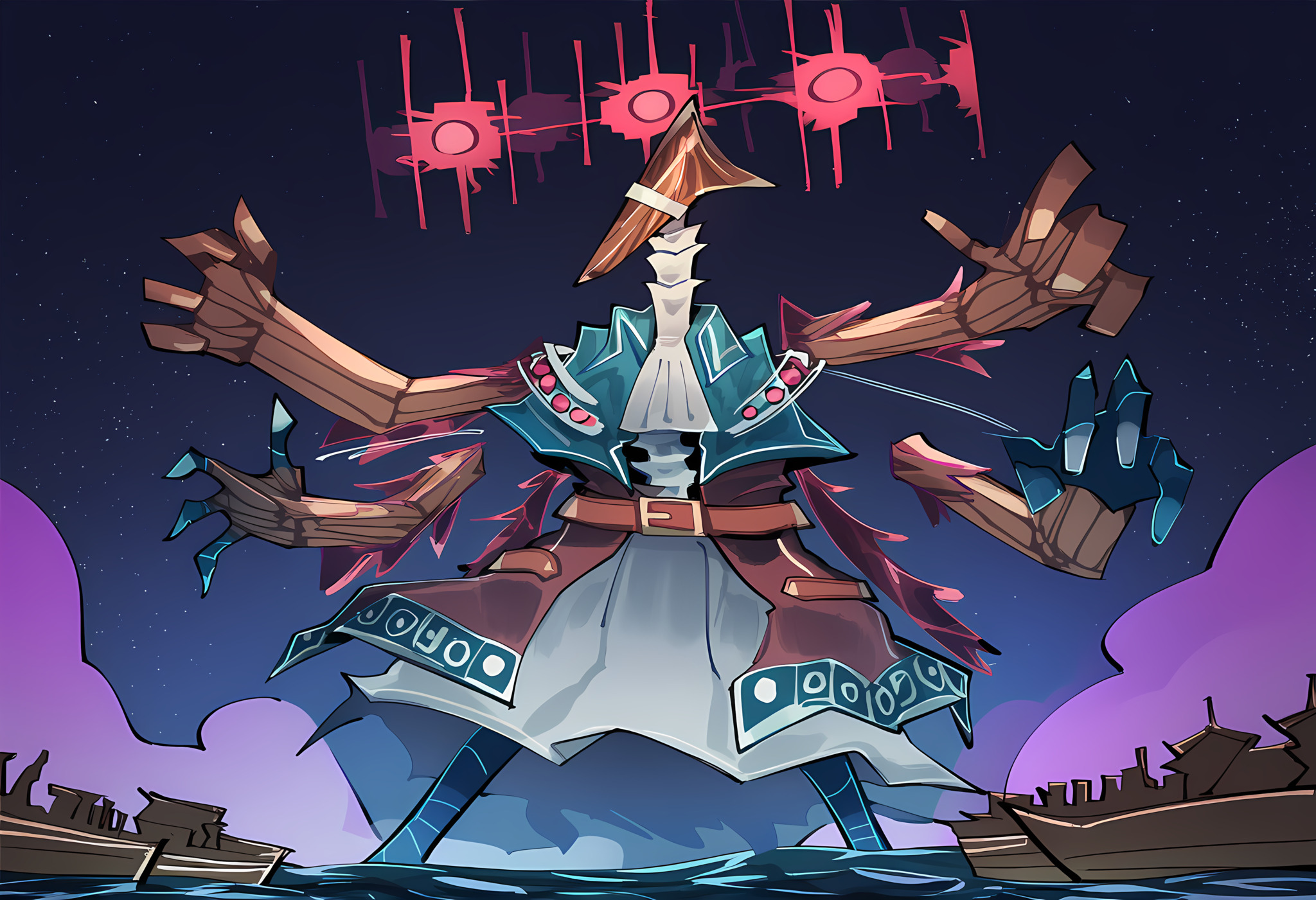 Artwork of Maria the Lucario's (PMMM-style) unnamed Witch form, a pirate/boat with an endless, murky ocean labyrinth full of books and lost ships.