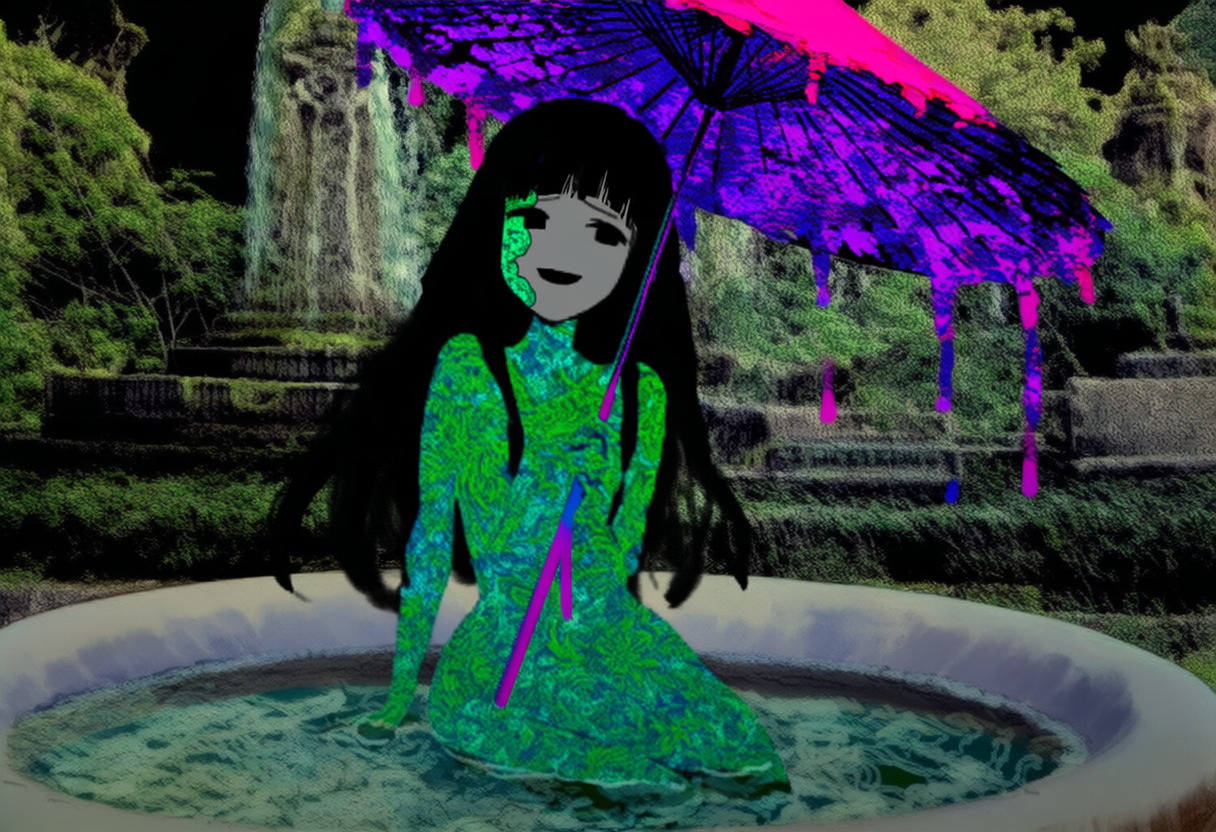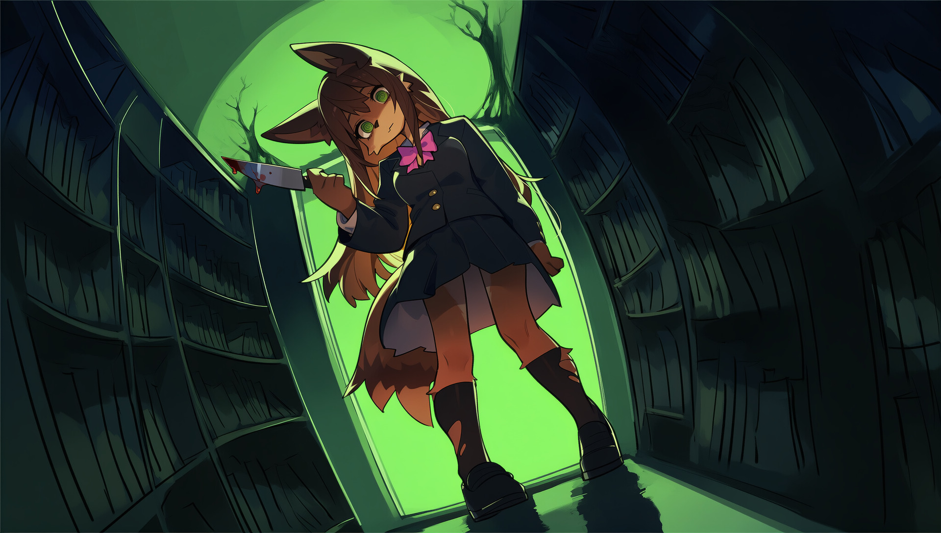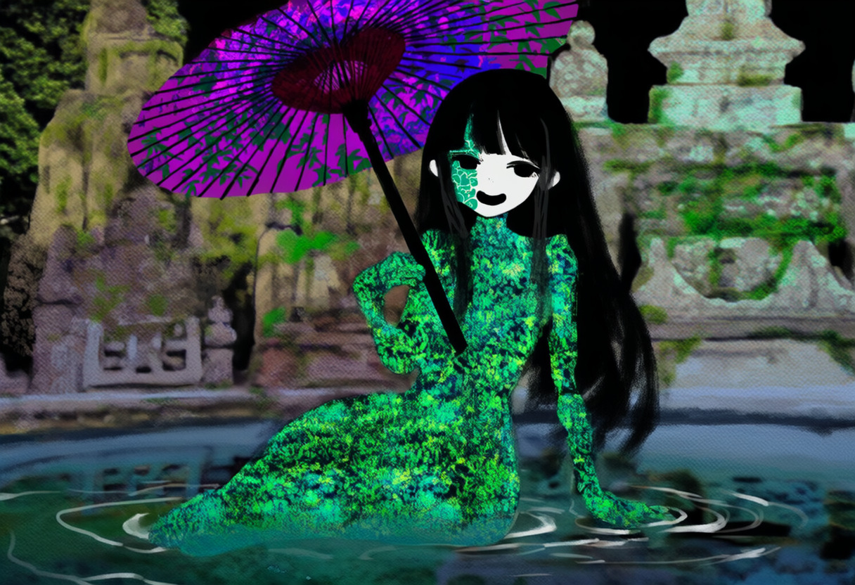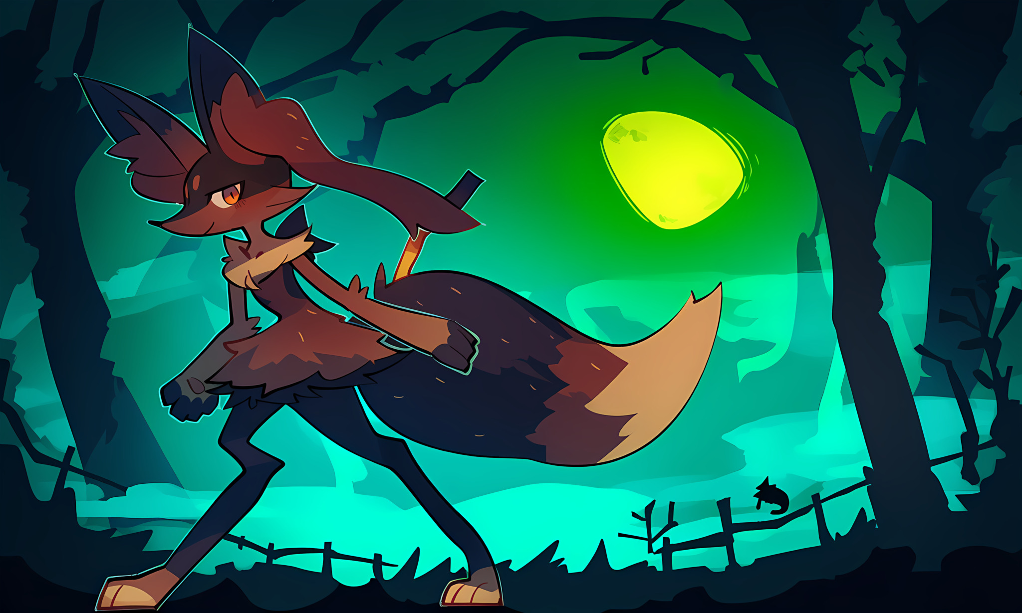 Artwork of Maria the Lucario's (PMMM-style) unnamed Witch form, a pirate/boat with an endless, murky ocean labyrinth full of books and lost ships.